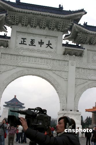 十二月五日,因臺灣當局執意拆除臺北“中正紀念堂”牌樓“大中至正”四字引發的風波升級。臺灣媒體大陣仗在現場采訪,僅攝像三角架就擺放了數十個。圖為一名電子媒體的記者在拍攝民眾抗議的場面。中新社發 董會峰 攝
