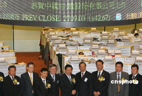 十二月七日,中國中鐵在香港掛牌上市。中國中鐵董事長石大華(右五)在上市儀式后表示,“先A后H”的上市模式非常成功,他對中鐵在上海及香港的股價表現都非常滿意,但日后大型國企是否都采納先A后H的模式,要由中央領導決定。中新社發 武仲林 攝