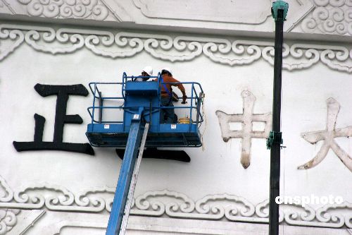 十二月七日,歷時近七個小時的施工,臺北“中正紀念堂”懸掛二十七年的“大中至正”牌匾被拆除。數百名民眾在大門外廣場觀看。中新社發 董會峰 攝