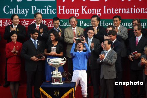十二月九日,二零零七年國泰航空國際賽馬日在香港沙田馬場舉行,四場國際賽事包括香港杯、香港瓶、香港一哩錦標及香港短途錦標,香港馬在其中兩場奪冠,成績不俗。特首曾蔭權出席并向獲得香港杯的選手頒獎。中新社發 武仲林 攝