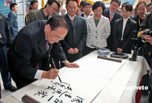 十二月十一日,在泉州參加“二00七泉臺產業合作投資洽談會”的國民黨副主席關中先生,來到中國閩臺緣博物館,親筆寫下“閩臺一家親 淵源流長”的題詞,為兩岸未來送上美好祝福。當日,“二00七泉臺產業合作投資洽談會”在泉州開幕。中新社發 傅丹丹 攝