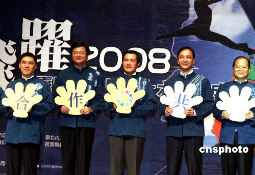十二月二十七日,“飛躍二00八北臺區(qū)域發(fā)展成果展”在臺北縣政府舉行,前臺北市市長馬英九及八縣市首長出席。圖為馬英九(中)、臺北市長郝龍斌(左一)、臺北縣長周錫瑋(左二)、桃園縣長朱立倫(右二)、新竹縣長鄭永金等人,身穿臺北縣三峽藍(lán)染特色服裝登場。中新社發(fā) 董會峰 攝