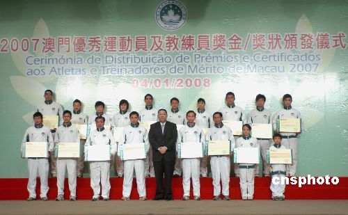 一月四日晚,澳門社會文化司崔世安司長在漁人碼頭向2007年澳門優秀運動員及教練員頒發獎金和獎狀,以表揚他們在賽事中獲得的優異成績。圖為崔世安司長與部分優秀運動員教練員合影。中新社發 史利 攝