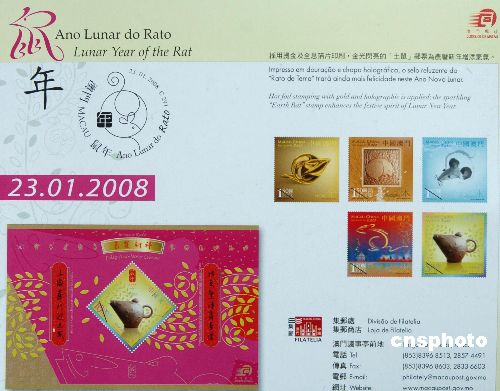 澳門郵政局將于一月二十三日發行第三輯生肖系列郵品的第一套《鼠年》紀念郵票,五枚郵票面值分別為1.5至5澳元。郵票圖案由林子恩先生設計,第三輯設計概念以五行的“金、木、水、火、土”來表達,采用天干算法推算五行屬性,而今年鼠的五行屬性為“土鼠”,所以五枚郵票中“土鼠”是主角。同時發行的還有小型張和首日封及以“鼠”為造型的精致茶壺。中新社發 史利 攝