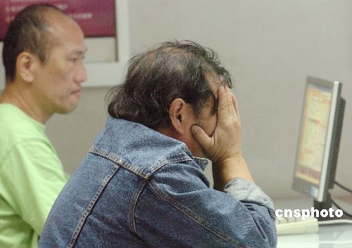 一月二十二日,受環球股市下挫影響,港股急挫二千零六十一點二三(2061.23)收市,創歷來最大點數跌幅。圖為當日股民在銀行關注行情,對股市表現極度無奈。中新社發 鄧慶樂 攝