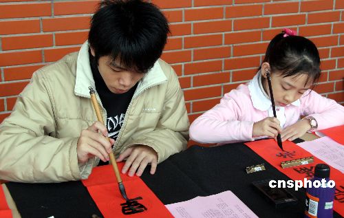 圖為兩位青少年書法愛好者正在寫春聯。
