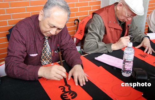 圖為兩位功底深厚的書畫大家正在為民眾書寫春聯。