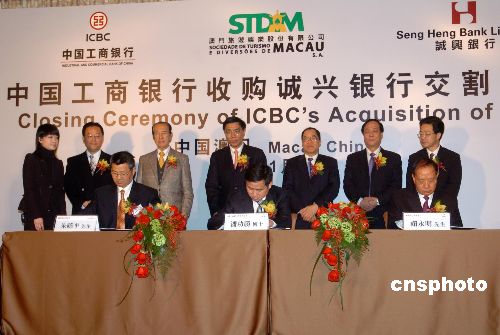 1月28日,“中國工商銀行收購誠興銀行交割儀式”在澳門美高梅酒店舉行。工商銀行同意以約46.83億元澳門幣收購誠興銀行共119900股普通股,占誠興銀行已發(fā)行股本總額的79.9333%。誠興銀行是一家成立于1972年的澳門持牌銀行,現(xiàn)為澳門旅游娛樂公司集團成員,位居澳門金融市場三甲之列。中新社發(fā) 史利 攝