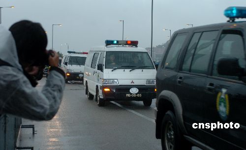 押解歐文龍的囚車(白色)在警車的護(hù)衛(wèi)下駛?cè)氚拈T(mén)終審法院。