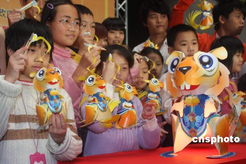 臺北市將從2月15日起舉辦為期十天的“囍迎曙光耀繁城”盛大燈節(jié),臺北市政府還將向市民發(fā)放十萬盞由臺灣著名紙雕藝術(shù)家洪新富創(chuàng)作的“豐足鼠”小提燈。1月31日,首批臺北學(xué)童領(lǐng)到了“豐足鼠”小提燈。中新社發(fā) 耿軍 攝