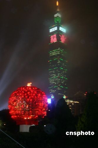 2月中旬,2008臺北花燈節在臺北市熱鬧舉行,今年主題為“囍迎曙光耀繁城”。主燈(圖中紅色圓燈)為金鼠娶親,由一百只造型卡通的老鼠組成,主燈與遠處臺北一0一大樓交相輝映。中新社發 徐長安 攝