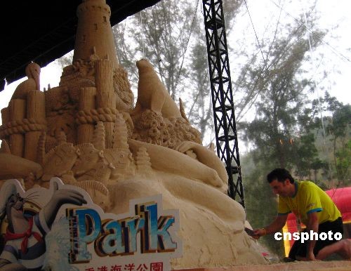 香港海洋公園將于三月二十一日至四月二十日推出“高清動物月”,并將舉辦香港首個大型沙雕展覽,吉尼斯最高及最長沙雕藝術品的紀錄保持者Ted Siebert及其隊友將以二百噸沙進行創作。圖為十八日,一位藝術家正在進行沙雕創作。中新社發 陳伊敏 攝