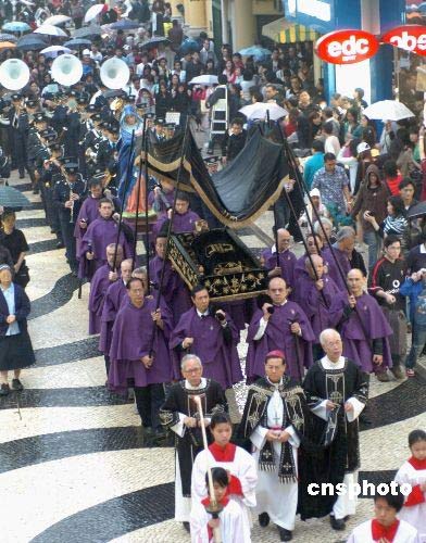 三月二十一日復活節前夜,澳門千余名教徒抬著天主教耶穌圣尸穿大街過小巷,走“拜苦路”。中新社發 史利 攝