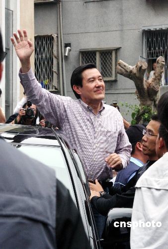 三月二十二日,二00八臺灣地區領導人選舉投票。中國國民黨候選人馬英九在臺北一個投開票所投票后,接受眾多媒體的采訪。中新社發 黃少華 攝