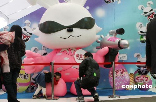 三月二十三日,一名小朋友與香港一商場內的巨型復活兔合影留念。復活節期間,香港眾多市民通過購物、旅游等休閑方式,歡度假期。中新社發 武仲林 攝