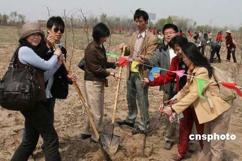 4月5日,由臺灣成人教育學(xué)會、商業(yè)教育學(xué)會以及在天津讀書的臺灣籍學(xué)生代表40余人組成的愛心團(tuán)隊(duì),來到“愛心媽媽”王愛麗創(chuàng)辦的天津市太陽村特殊兒童救助服務(wù)中心,參加海峽兩岸“根連根”植樹活動,與天津大專院校學(xué)生代表一起種植“友誼樹”,冀望兩岸同胞的友誼,枝繁葉茂,茁壯成長。中新社發(fā) 田齊 攝