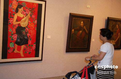 4月16日,“侯佩芩2008油畫個展”在臺北縣政府西側藝廊登場,不過此侯佩芩非臺灣名主播,而是臺灣藝術大學四年級學生。圖為一名婦女推著嬰兒車在欣賞《少女之夢》,此畫作中的女子容貌頗像其作者侯佩芩。中新社發 董會峰 攝