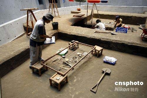十三行博物館位于臺北縣八里鄉淡水河?诮唤缣幍哪习,面積約為62500平方公尺,在1989至1992年間,因為在遺址上興建八里污水處理廠,引發附近居民以及學者抗議。在社會輿論的聲援下,當局一邊開挖古物、一邊興建污水處理廠,最後在廠內保留出一塊古跡保護區,并在污水處理廠旁建造十三行博物館,保存出土文物。 1957年地質學者林朝綮在這里發現史前的煉鐵遺跡,同時亦發現許多史前陶片、石支腳與凹石等,因而判斷此處為史前遺址,并依據該地地名將它定名為十三行遺址。十三行人是目前臺灣唯一確定擁有煉鐵技術的史前居民,可能是臺灣平埔族凱達格蘭人的祖先。十三行文化屬于北臺灣地區的金屬器時代,時間大致從2300年前開始,到漢人進入本地區之后才結束。圖為重現當年考古發現的場景。中新社發 杜洋 攝