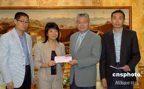 五月十三日,澳門中聯辦副主任徐澤(右二)接受盧德華女士(左二)交來的二十五萬元港幣善款。這是五位澳門四川省政協委員捐助,用于救助四川地震災民的善款。中新社發 史利 攝