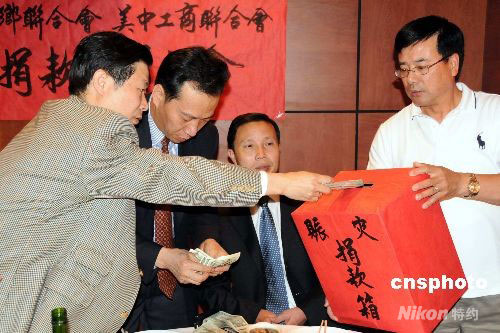 當(dāng)?shù)貢r(shí)間十四日晚,四十一位閩籍華僑在華盛頓中國(guó)城發(fā)起四川大地震賑災(zāi)募捐,十分鐘現(xiàn)場(chǎng)捐款就達(dá)二萬(wàn)一千多美元。圖為美國(guó)福建同鄉(xiāng)聯(lián)合會(huì)僑胞積極為四川災(zāi)區(qū)捐款,表達(dá)愛心。中新社發(fā) 邱江波 攝