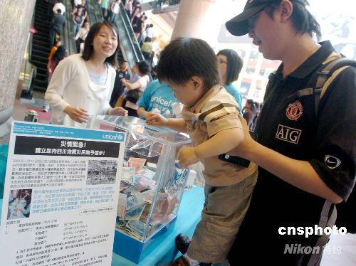 五月十五日,聯(lián)合國兒童基金會香港委員會在香港銅鑼灣時代廣場設(shè)立籌款站,為四川地震災區(qū)籌款。圖為一對父子路過籌款站,慷慨解囊。四川發(fā)生大地震后,香港各界積極發(fā)起籌款賑災,向四川災區(qū)伸出援手。中新社發(fā) 鄧慶樂 攝