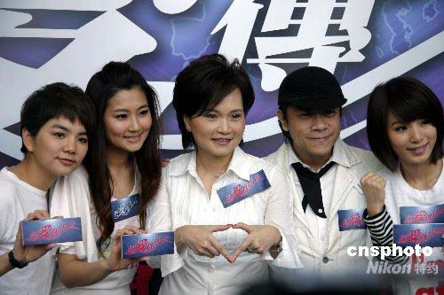 臺灣演藝界人士將于18日晚共同參與四川賑災晚會“把愛傳出去”。張小燕、張菲、吳宗憲、蔡康永、周杰倫等知名藝人接到邀請并積極投入晚會籌備工作,圖為名主持沈春華(中)、蔡康永(右二)與演唱組合SHE號召民眾以及更多藝人參與晚會及募款活動。中新社發 劉舒凌 攝