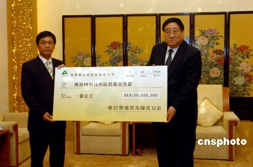 五月二十日,雅居樂地產有限公司通過中聯辦向四川地震災區捐款一億港元。圖為集團主席陳卓南與中聯辦主任高祀仁(右)出席捐款儀式。中新社發 鄧慶樂 攝
