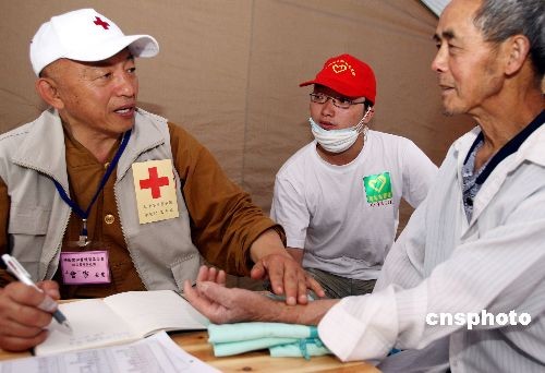 5月21日上午,臺灣紅十字醫療隊在四川省廣漢市高坪鎮災民安置中心安營扎寨開展醫療救治。醫療隊的中醫師陳友鳳先生(左),為一名什邡市龍居村65歲的老漢把脈診病。由于當地農民地方口音極重,一名會說普通話的四川大學生志愿居中擔任翻譯。