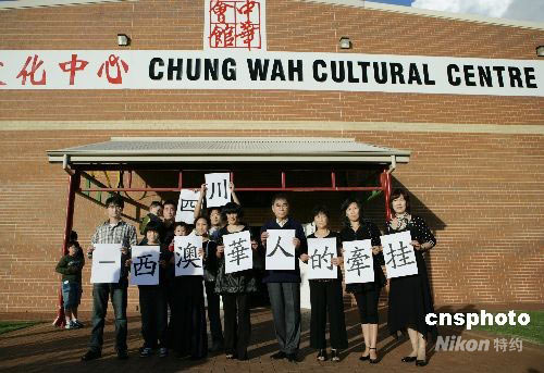 當地時間5月25日下午四時,西澳大利亞華人聚集在中華文化中心,舉辦“祈福零八,平安中國”活動為四川地震募集善款。其中,來自河南同鄉會的華僑打出了“四川——西澳華人的牽掛”的標語。中新社發 高周丹 攝
