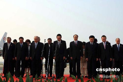 5月26日,中國國民黨主席吳伯雄抵達南京,中共中央臺灣工作辦公室主任陳云林到機場迎接。吳伯雄主席將率中國國民黨訪問團于26日至31日在南京、北京、上海訪問。他將此行定位為“工作會談”,一方面要為未來馬英九就任后的兩岸關系開路,一方面也要前往南京中山陵拜祭。圖為吳伯雄、陳云林等南京祿口機場默哀悼念四川地震遇難者。中新社發 盛佳鵬 攝