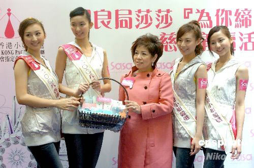 六月二十日,二零零八年香港小姐十二位候選佳麗,在香港出席保良局與莎莎化妝品公司合辦的“為你締造美麗人生”慈善義賣活動。同場一至四號候選佳麗文柏姿、倫紫玄、張舒雅、高海寧(右起)獲頒“最具智慧佳麗”獎項,由莎莎化妝品有限公司副主席郭羅桂珍頒贈獎品。中新社發 鄧慶樂 攝