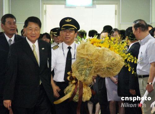 7月4日上午,南航董事長劉紹勇親自駕駛大陸首班抵臺包機,創下民航業者由董事長親駕客機抵臺的首例。圖為劉紹勇(著帽者)抵臺后,受到華航總經理孫洪祥(前)等的熱烈歡迎。中新社發 黃少華 攝