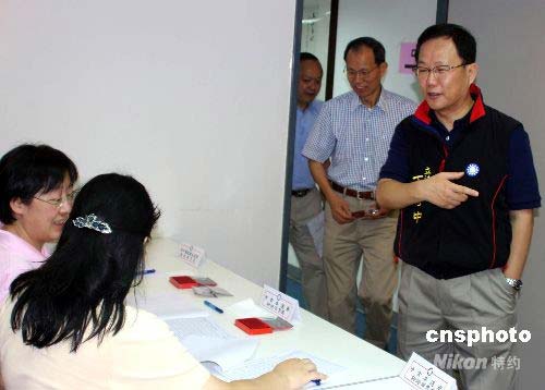 7月26日,中國國民黨舉行中常委選舉投、開票。國民黨籍“立法委員”丁守中(右),第一個來到位于臺北市議會的投票所登記參加投票。中新社發 董會峰 攝