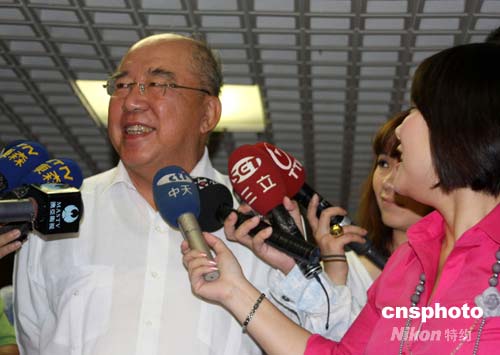 7月26日,中國國民黨主席吳伯雄在臺北參與國民黨中常委選舉投票后接受記者采訪,笑著重申將應(yīng)邀參加北京奧運會。中新社發(fā) 董會峰 攝