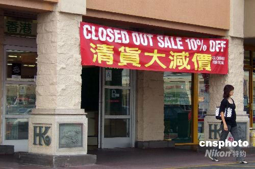 位于美國洛杉磯縣西柯汶那市的香港超市,近日掛出“清貨大減價”的橫幅,將于近期停業。在洛杉磯華人聚居區,香港超市是華人經常光顧的連鎖超市,受到美國經濟不景氣和物價上漲等因素影響,當地華人消費能力下降,一些經營業績不佳的華人商鋪和超市被迫關門歇業。中新社發 張煒 攝