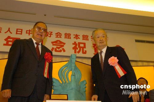 9月5日,日本財團法人日中友好會館舉行大型酒會慶祝該會本館建館20周年,中國日本友好協(xié)會會長宋健、中國駐日大使崔天凱、日本眾院議長河野洋平等數(shù)百名中日友好人士出席。圖為宋健會長(左)代表中方向日中友好會館會長林義郎先生贈送賀禮——雕塑作品《鳳凰》。中新社發(fā) 朱沿華 攝