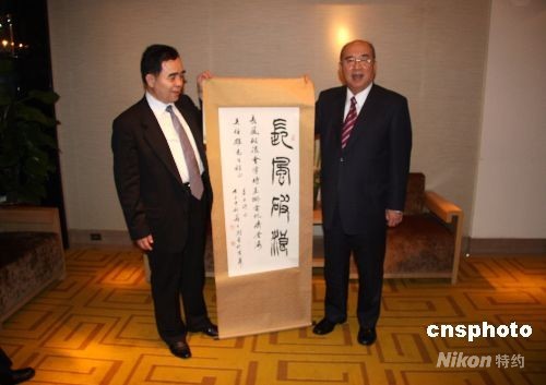 圖為柳斌杰向吳伯雄贈送“長風破浪”的書法條幅。