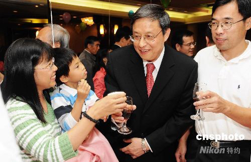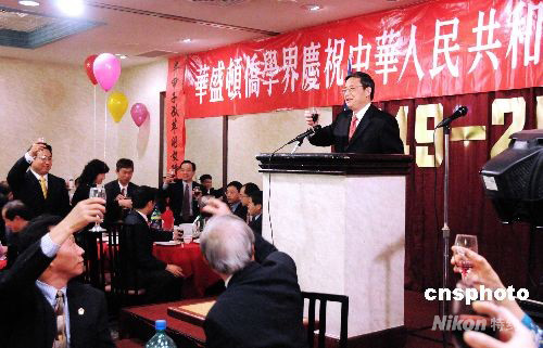 當地時間9月21日晚,中國駐美大使周文重(講臺上)、公使劉光源(左一)夫婦、公使謝鋒夫人、總領事吳冬梅等參加當地僑學界慶祝中華人民共和國成立五十九周年晚會。周文重在晚會上致詞說,建國以來尤其是改革開放30年來,中國建設成就輝煌,2008年的中國經受了各種嚴峻的考驗,兩岸關系出現了新的轉機,中華民族復興正面臨難得的歷史機遇。中新社發 邱江波 攝