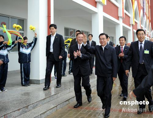 9月24日,賀國強來到固原回民中學慰問師生。當日,寧夏回族自治區成立50周年慶祝活動中央代表團團長賀國強率一分團到固原市慰問。中新社發 廖攀 攝