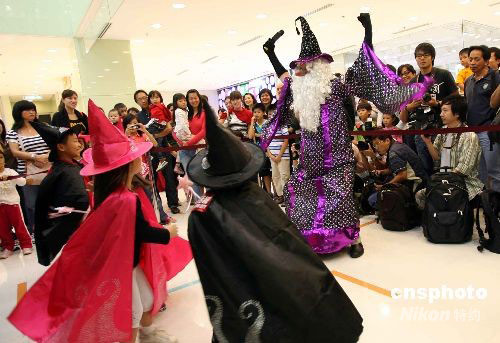 十月七日,香港海港城舉行迎接萬(wàn)圣節(jié)活動(dòng),一群調(diào)皮的小朋友與魔法師跳舞狂歡,營(yíng)造氣氛。中新社發(fā) 洪少葵 攝