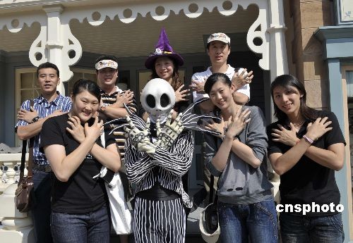 十月十日,中國女子排球隊成員到訪香港迪斯尼樂園。期間嘉賓把握機會,跟喜愛的迪斯尼朋友合照。中新社發 鐘新 攝