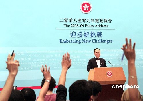 十月十五日,香港特區行政長官曾蔭權向立法會發表二零零八至零九年施政報告后于下午二時三十分在中環政府一樓會議廳舉行舉行記者會。圖為香港行政長官曾蔭權正在回答記者提問。中新社發 張勤 攝