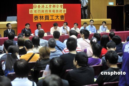 十月二十日,香港工聯會早上安排泰林員工與臨時清盤人開會,大約二百多人出席。香港有六十二年歷史的泰林電器日前全線結業,受影響的員工被拖欠的薪金及遣散費,初步估計多達一千萬港元。中新社發 譚達明 攝
