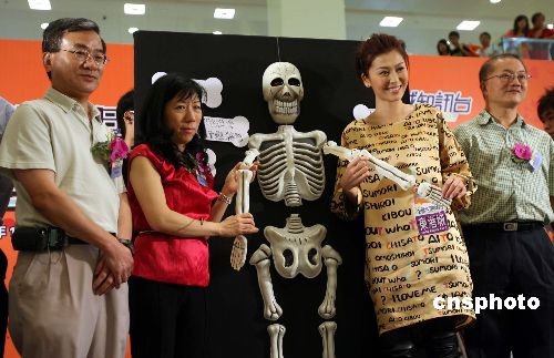 二十六日,香港骨質疏松基金會為響應“世界骨質疏松日”在將軍澳東港城舉辦名為“全城骨健站起來嘉年華”,透過一系列活動,提升市民對骨質疏松癥的認識及關注。香港骨質疏松基金會會長創會會長劉明珠醫生(左二)、麥勤興醫生(左)及藝人周麗淇(右二)等主持開幕儀式。中新社發 洪少葵 攝