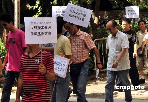 十月二十八日,香港逾百名的士司機到立法會外請愿,要求撤銷“短加長減”方案。方案將市區的士起價由十六元加至十八元,而乘搭的士長途車,則只需支付現時約八折的車資。中新社發 譚達明 攝