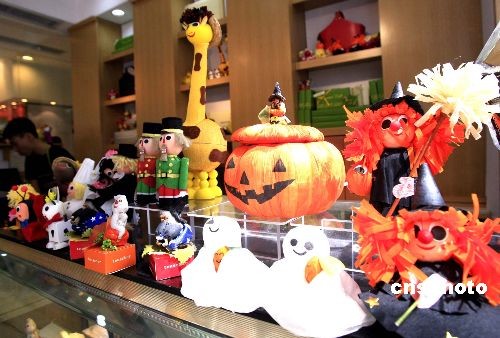 十月二十八日,香港“萬圣節”氣氛越來越濃,商場內各式“鬼節”飾品,吸引過路人的目光。中新社發 張勤 攝