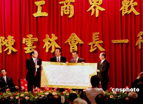 11月6日,臺灣工商界在臺北圓山飯店設午宴歡迎海協會會長陳云林一行。臺灣工商界人士稱贊此次簽署的四項協議,幾乎每一件都關系工商業界的發展。從中小企業到大企業,從傳統產業到高科技產業,兩岸工商界交流朝著良性、全面性發展。中新社發 黃少華 攝