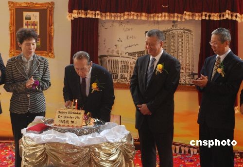 “葡京三十八載劃時代輝煌展” 十一月二十五日在澳門葡京酒店開幕,欣逢澳門博彩股份有限公司行政總裁何鴻燊(左二)八十七歲生日。圖為何鴻燊在嘉賓祝福聲中吹熄蛋糕上的蠟燭。中新社發 畢永光 攝