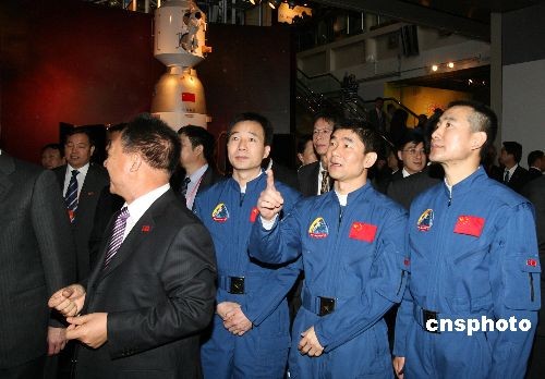 十二月六日,“中國首次太空漫步航天展”在香港科學館揭幕,神舟七號返回艙、航天服和航天員出艙后所展示的國旗等珍貴展品和圖片在展會上亮相。香港特區政府政務司司長唐英年、神舟七號載人航天飛行赴港代表團團長暨中國載人航天工程副總指揮張建啟、神七航天員翟志剛、劉伯明、景海鵬等出席揭幕儀式。中新社發 武仲林 攝