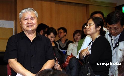 就前臺灣地區領導人陳水扁等人涉及“國務機要費”案、龍潭購地案、南港展覽館案及洗錢案等四案,臺灣檢察機構十二日偵查終結,將陳水扁、吳淑珍等十四人分別依“貪污治罪條例”、偽造文書、違法“洗錢防制法”等罪名提起公訴。圖為“惜字如金”的“最高法院檢察署特別偵查組”發言人陳云南(左)在記者會前難得輕松與媒體問答。中新社發 劉舒凌 攝